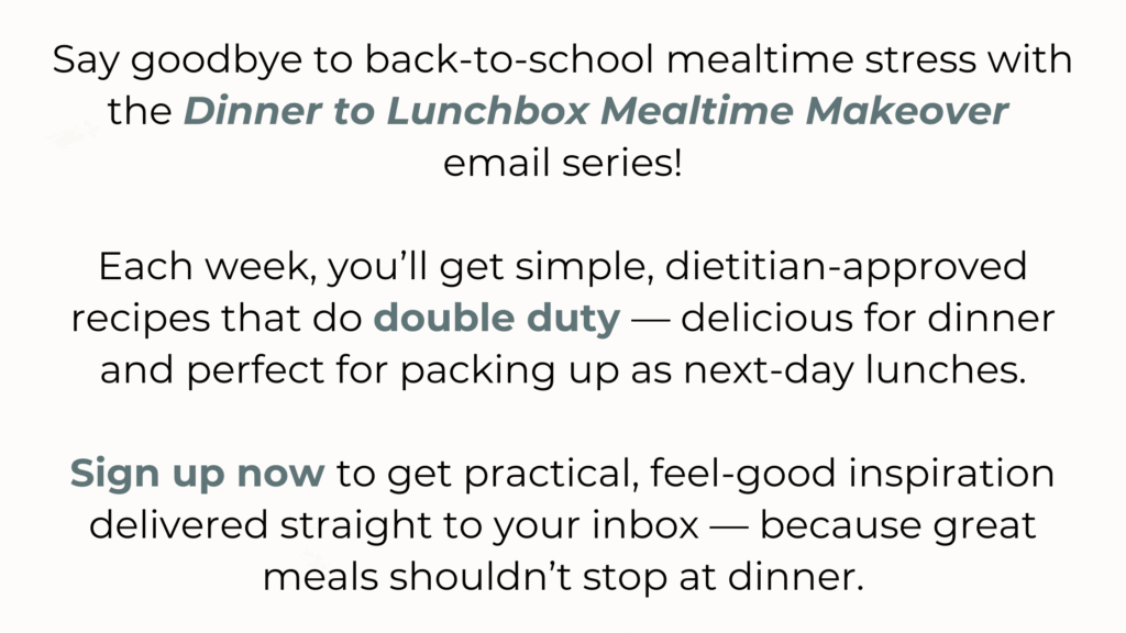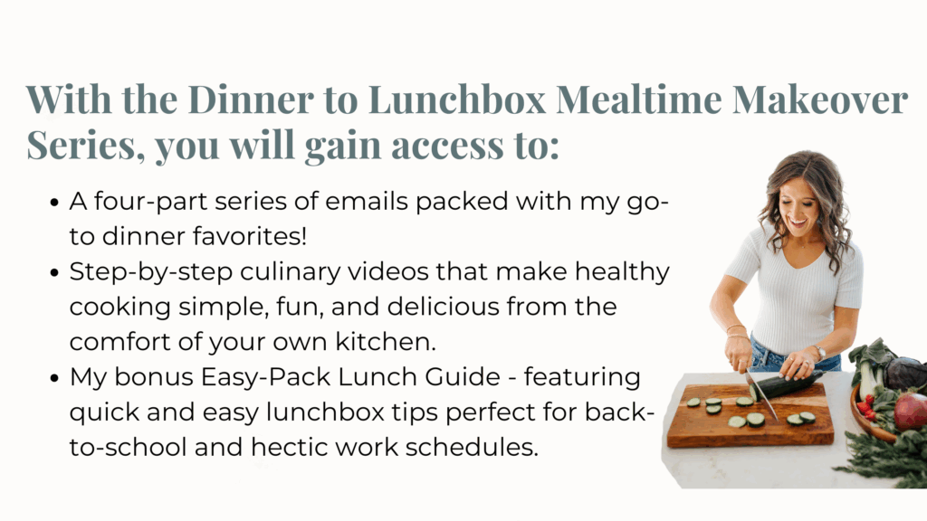 Access the Dinner to Lunch Mealtime Makeover email series + BONUS Easy-Pack Lunch Guide by signing up below!
